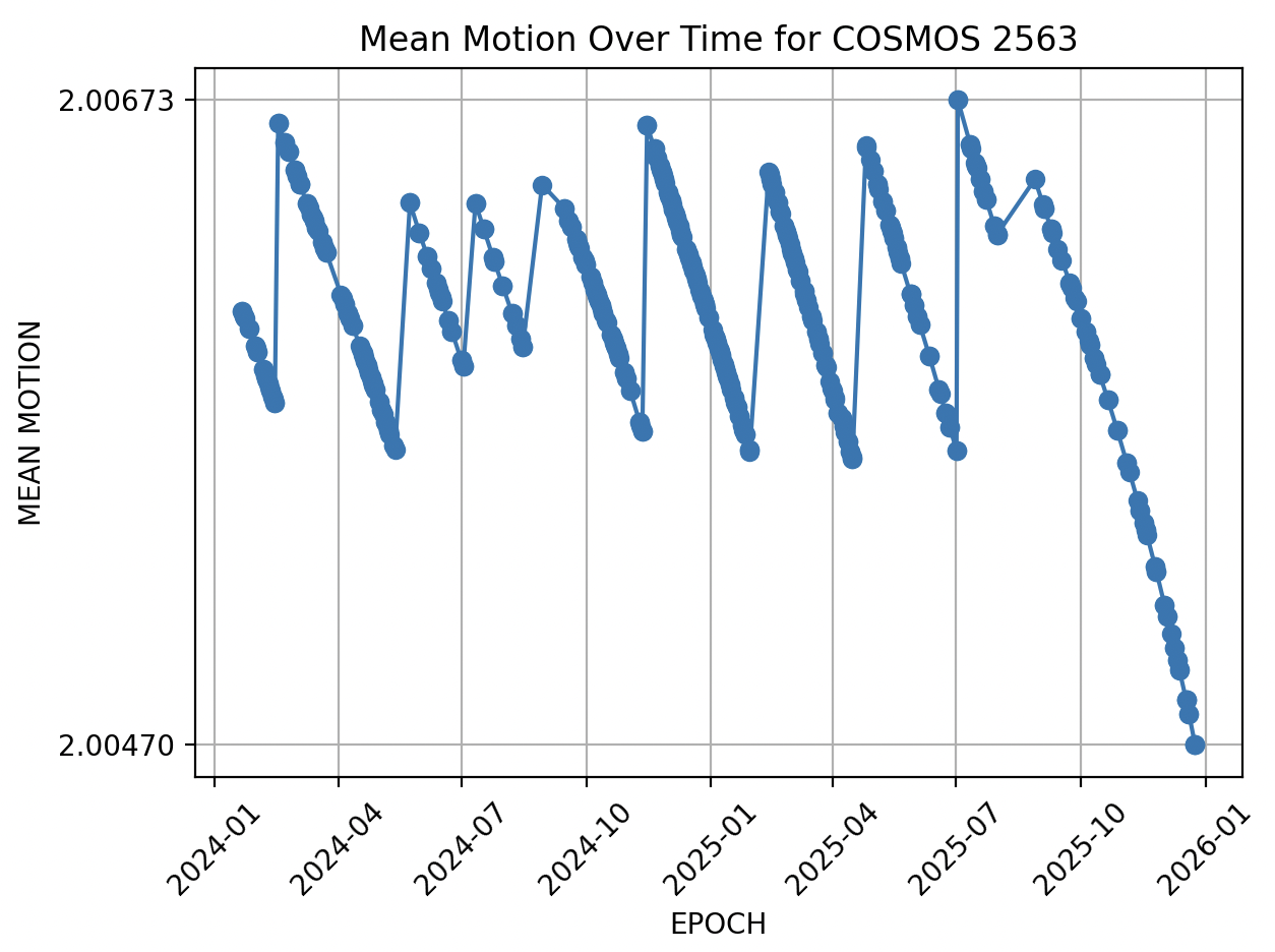 Now it appears that for Cosmos-2541, the orbit correction maneuver successfully conducted in March 2025 was the last one. Another satellite of those three, Cosmos-2563, appears to have failed at some point after the last successful maneuver in July 2025. Images below show the changes in mean motion that testify to the failures.